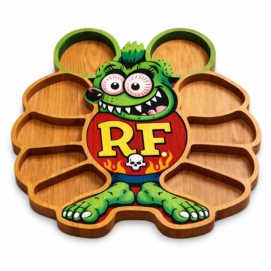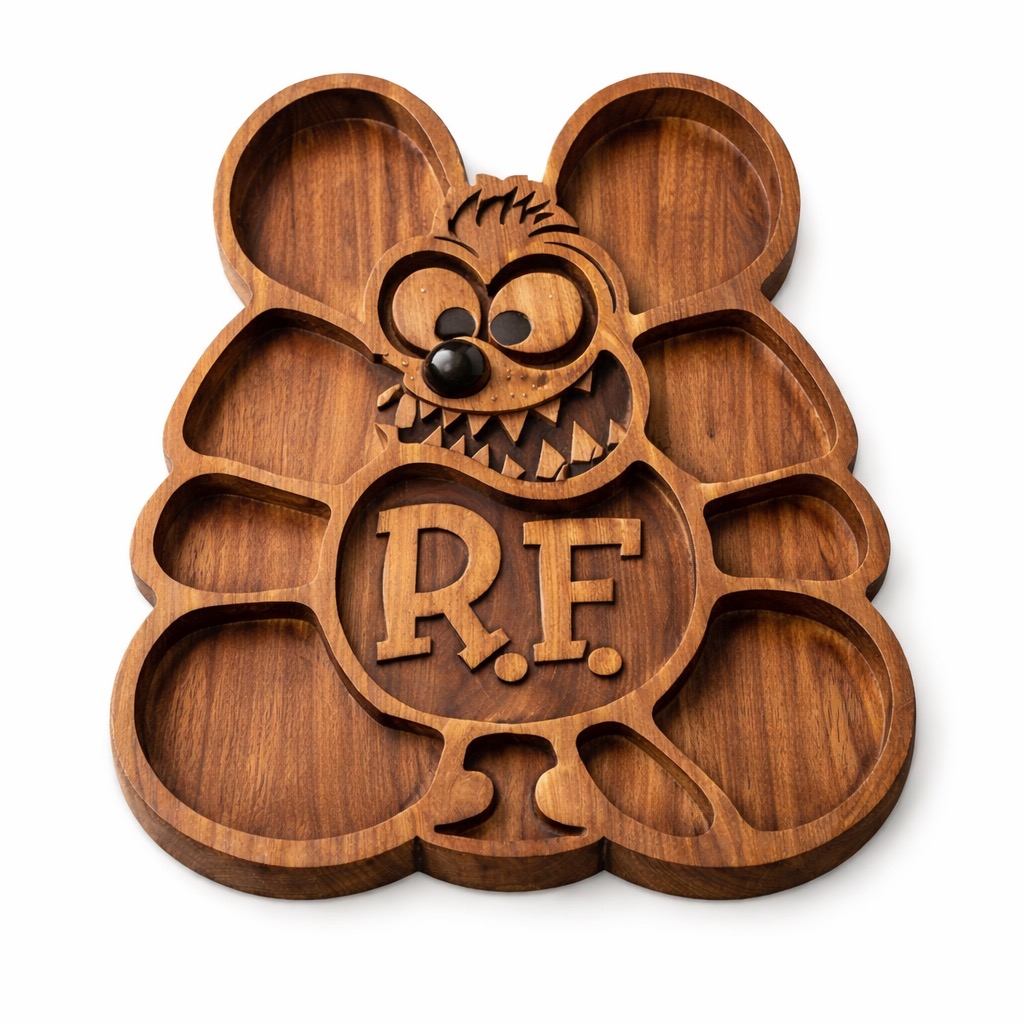 Hergestellt in der genauen und erkennbaren Rat Fink-Silhouette bleibt dieses Brett dem ursprünglichen Charakter treu und bietet ein durchdacht geschnitztes, mehrteiliges Layout. Es ist mehr als ein Serviertablett – es ist funktionale Tischkunst.